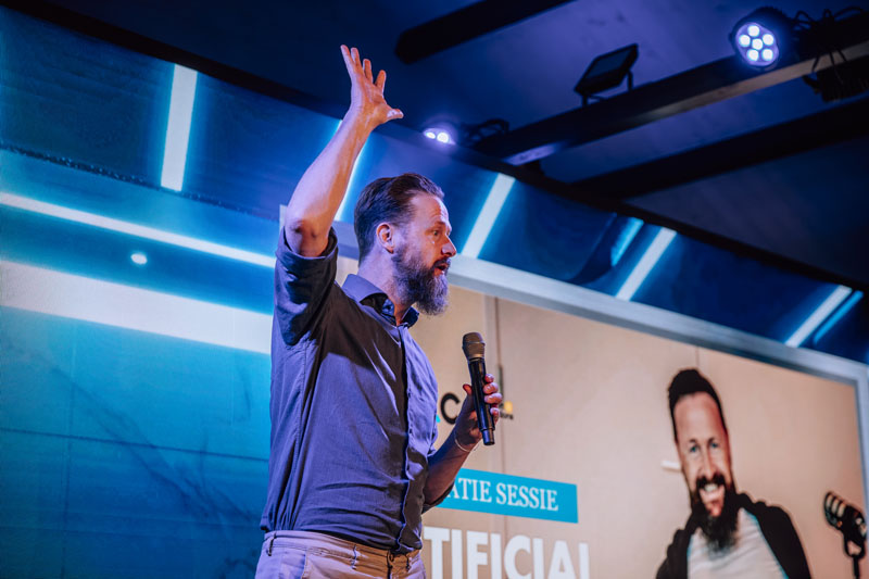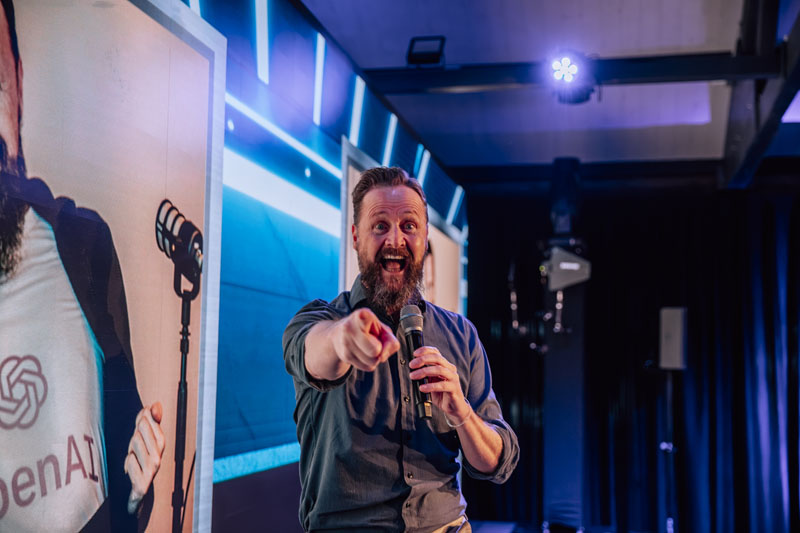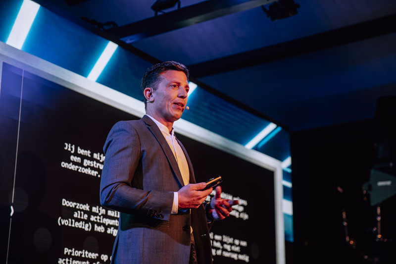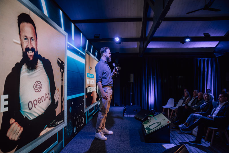 Ondernemer, schrijver en TEDx-ambassadeur Jim Stolze enthousiasmeerde het publiek met zijn energieke presentatie over AI. Hij liet zien hoe technologie kan bijdragen aan innovatie zonder dat de menselijke factor verloren gaat. Ook liet hij met een flinke dosis humor de kracht van prompten zien, wat resulteerde in een aantal mooie uitkomsten van het AI-model.